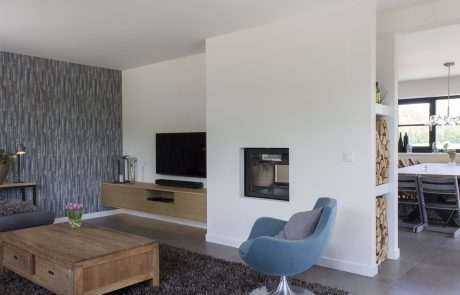 Tussen de zitkamer en de eetkamer is een tunnel-houthaard ingebouwd met aan de kopse zijde ruimte voor de houtblokken. Deze kopse zijde is een echte eyecatcher geworden!