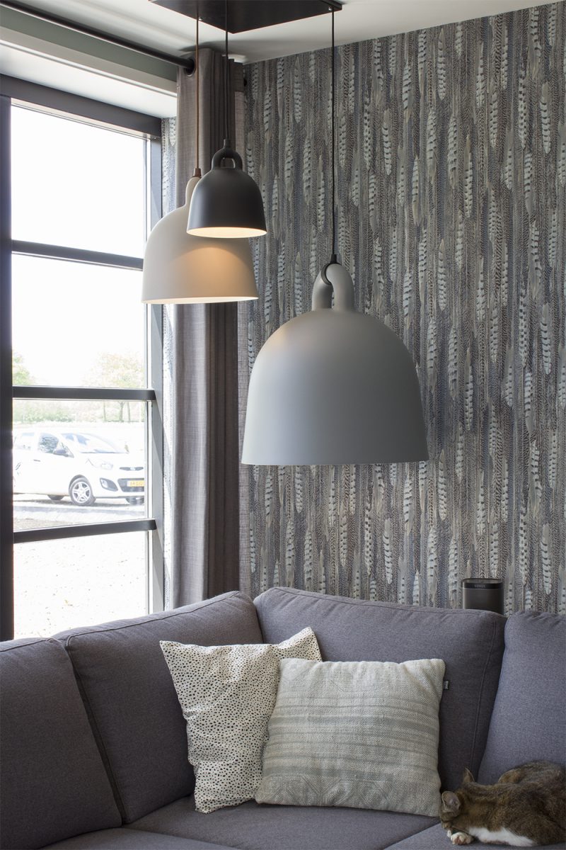 Deze woning was een onopvallende woning met groot achterstallig onderhoud midden tussen bomen en struikgewas. Totdat de nieuwe eigenaars het huis kochten en rigoureus gingen verbouwen naar een ontwerp van architect Rinke ter Haar. Het werd een prachtige moderne woning. Voor het interieur mocht ik een ontwerp maken. Ik heb voor een strakke inrichting gekozen in de kleuren wit, grijs, zwart en zacht groen in combinatie met het aqua groene behang Curious van BN Wallcoverings.